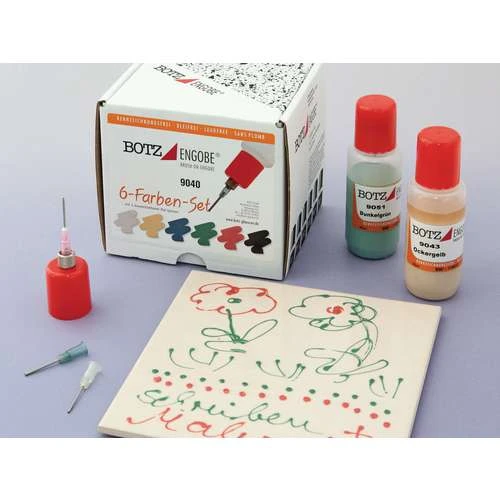 This Botz Engobe Set is a 10-piece set containing everything you need to get started right away and be able to paint creative decorations or produce fine lettering. It is an ideal starter set and would make an unusual gift.
