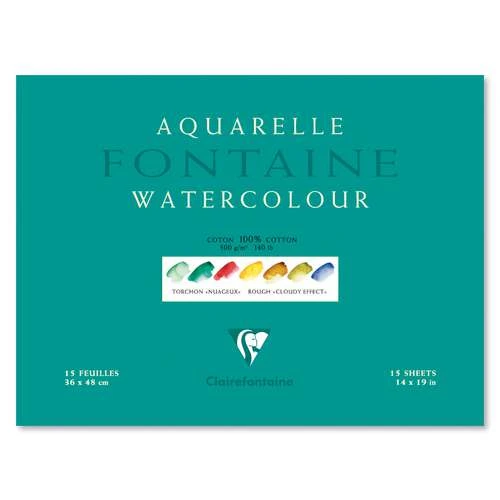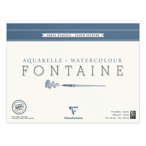 Clairefontaine Fontaine Cloud Texture Watercolour Paper is 100% cotton, 300gsm, pH neutral and free from optical brighteners. It is manufactured on a cylinder machine but the purity of the water and cotton used to make the pulp, combined with the quality and consistency of the glue coating (both in the pulp and on the surface) make this paper unique in its handmade-like finish. Using Clairefontaine Fontaine paper is a joy because it has a great capacity for absorption and resistance to wrinkling, whilst offering excellent colour reproduction and preserving the transparency of the colours The quality of the finish means retouching is also possible.