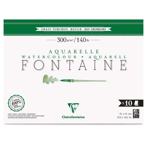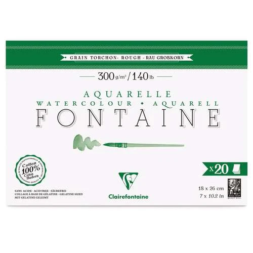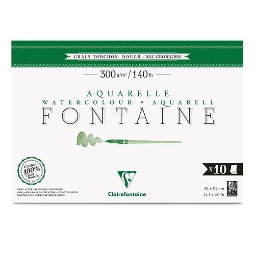 Clairefontaine Fontaine Extra Rough Watercolour Paper is 100% cotton, 300gsm, pH neutral and free from optical brighteners. It is manufactured on a cylinder machine but the purity of the water and cotton used to make the pulp, combined with the quality and consistency of the glue coating (both in the pulp and on the surface) make this paper unique in its handmade-like finish. Using Clairefontaine Fontaine paper is a joy because it has a great capacity for absorption and resistance to wrinkling, whilst offering excellent colour reproduction and preserving the transparency of the colours The quality of the finish means retouching is also possible.