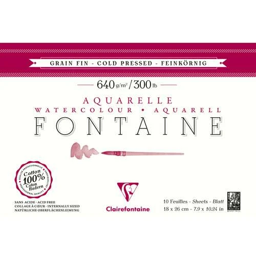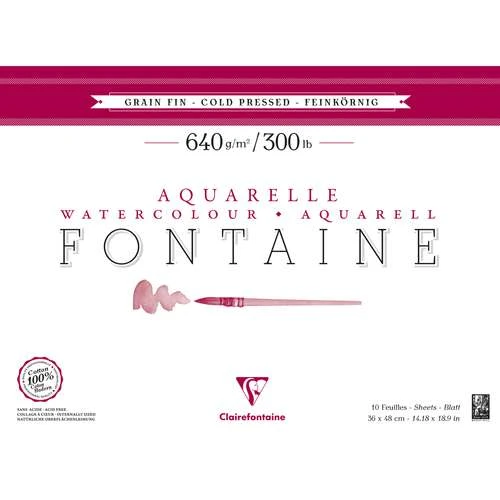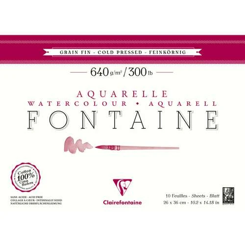 Clairefontaine Fontaine Watercolour Paper is a 640gsm high quality pure cotton paper, made without acid or optical brighteners. It is remarkable for its stability and preservation.
