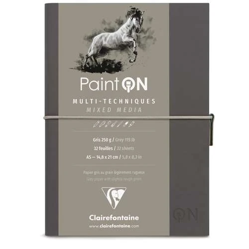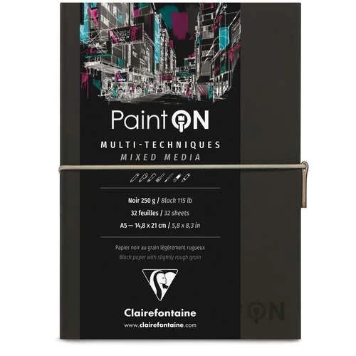 Each Clairefontaine Paint’On Sketchbook is available in A5 format, with 32 sheets and a soft cover that features and elastic and zip closure. There is a variation available for each of the Clairefontaine Paint’On Multi-Technique paper types including original, fine grain, natural, grey and black, each of which is suitable for a wide range of wet and dry media.