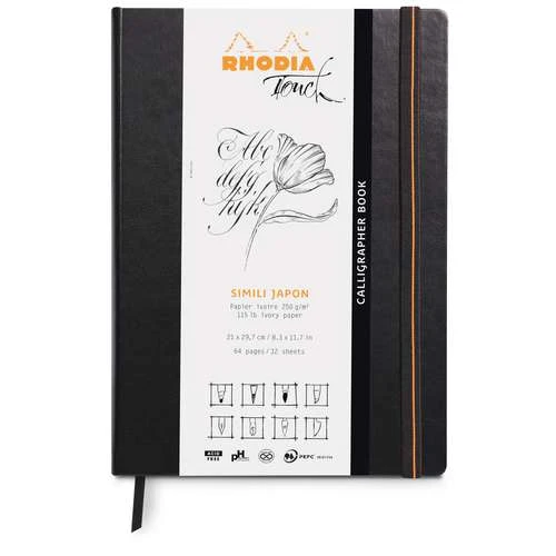 The Rhodia Touch Calligraphy book includes 64 sheets of natural white, imitation Japanese paper.