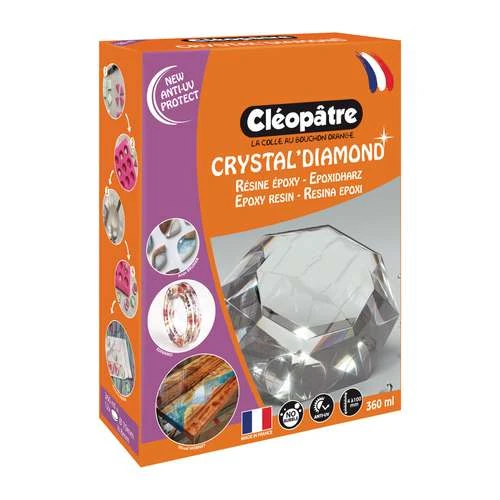 Cléopâtre Crystal Glass Resin is available in sets with a pair of gloves, a spatula and a measuring cup (and some creative ideas), or as a pack of 720ml without accessories.