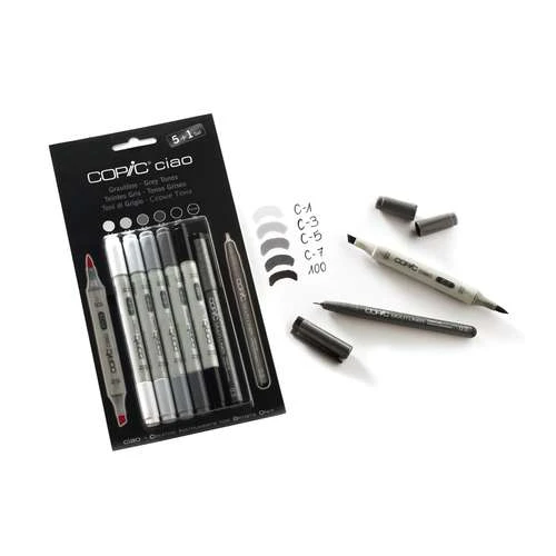 The Copic Ciao 5 + 1 Grey Tones Set contains Copic colour codes: C1, C3, C5, C7, 100