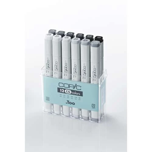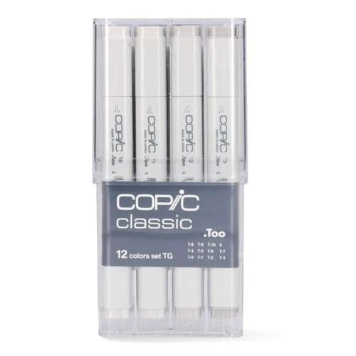 The Copic Classic Marker 12 TG (Toner Grey) Set contains the following colours: