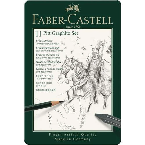 The Faber-Castell Pitt Graphite Set consists of an 11-part selection of accessories, pencils and chalks in various degrees of hardness, suitable for meeting professional demands.