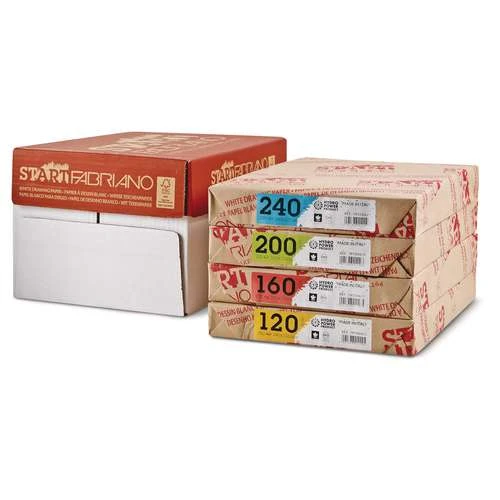 Fabriano Start Drawing Paper is a white drawing paper sold in various sizes and pack sizes, all available in the following weights: