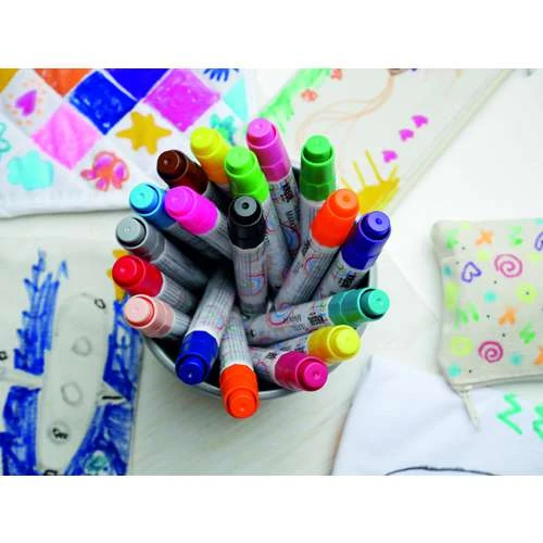 Kreul Javana Texi Mäx Sunny pens are water-based, lightfast and solvent-free, making them especially suitable for children. They have very robust tips giving a line thickness of 2-4mm. After drying, fix by ironing on a cotton setting. These Kreul Javana Texi Mäx Sunny pens are washfast to 60° C.