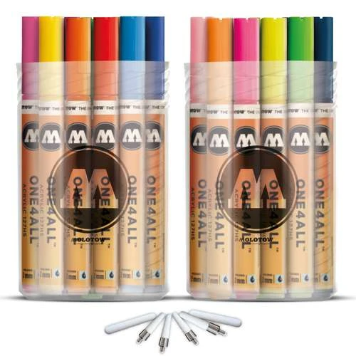The Molotow One4All 127HS complete kit combines the Molotow One4All 127HS main kits 1 and 2, and adds 2x Specialtech tip set extra-fine (1mm) and 1x round tip set fine (2mm).