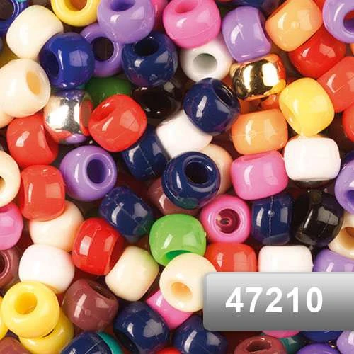 Packs of multicoloured plastic beads, 7-9mm in diameter, ideal for all creative uses.