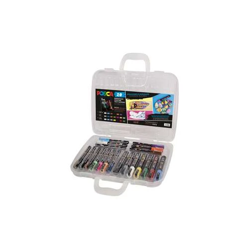 The Uni Posca Marker Classic Set is presented in a transparent, salmon-coloured plastic case with carrying handle, containing 20 assorted markers.