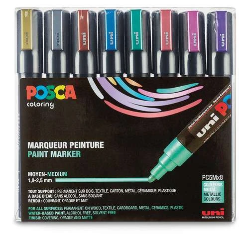 The Uni Posca PC5M Marker Metallic Set contains the following colours: gold, silver, bronze, metallic green, metallic violet, metallic red, metallic pink, metallic blue. The tips are 2.5mm.